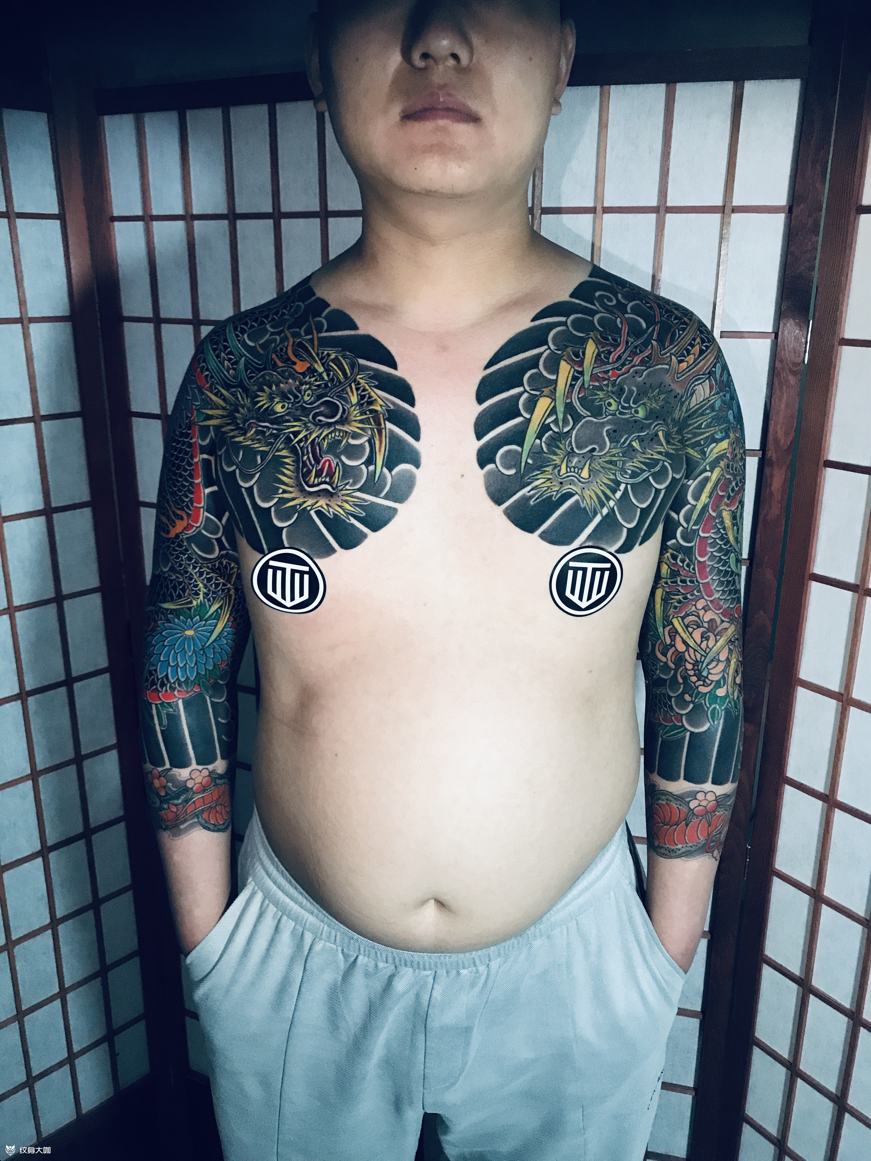 此半胛是根据大势至菩萨画像设计,前胸大势至菩萨头像,大臂是大势至菩萨法器莲花,背景以祥云为主,体现出祥和喜乐的意境。 大势至菩萨代表的是智慧,慈悲喜舍,力量,光明。也代表行,所到之处佛光永照,化煞化凶。 承载者的职业跟车有关,大势至菩萨是他的守护菩萨,将菩萨刺入皮肤必会保佑其平安,这是承载者外部的加持。但个人的修养也很重要,需要在日常生活中和工作中注意“谨慎”和“专注”,这两点不仅能保平安,也是修智慧的态度。 想达到此次纹身的目的需要内外结合。