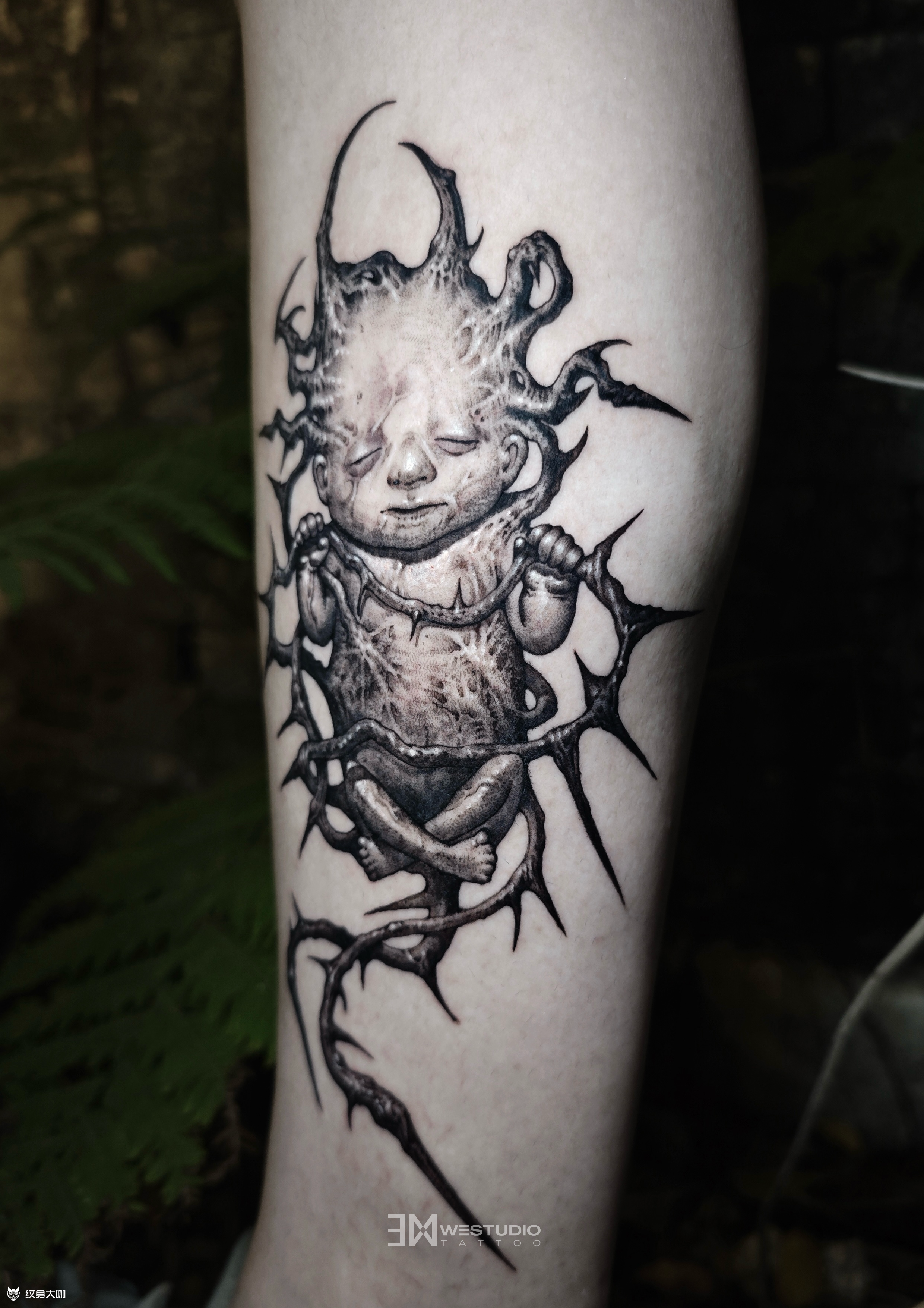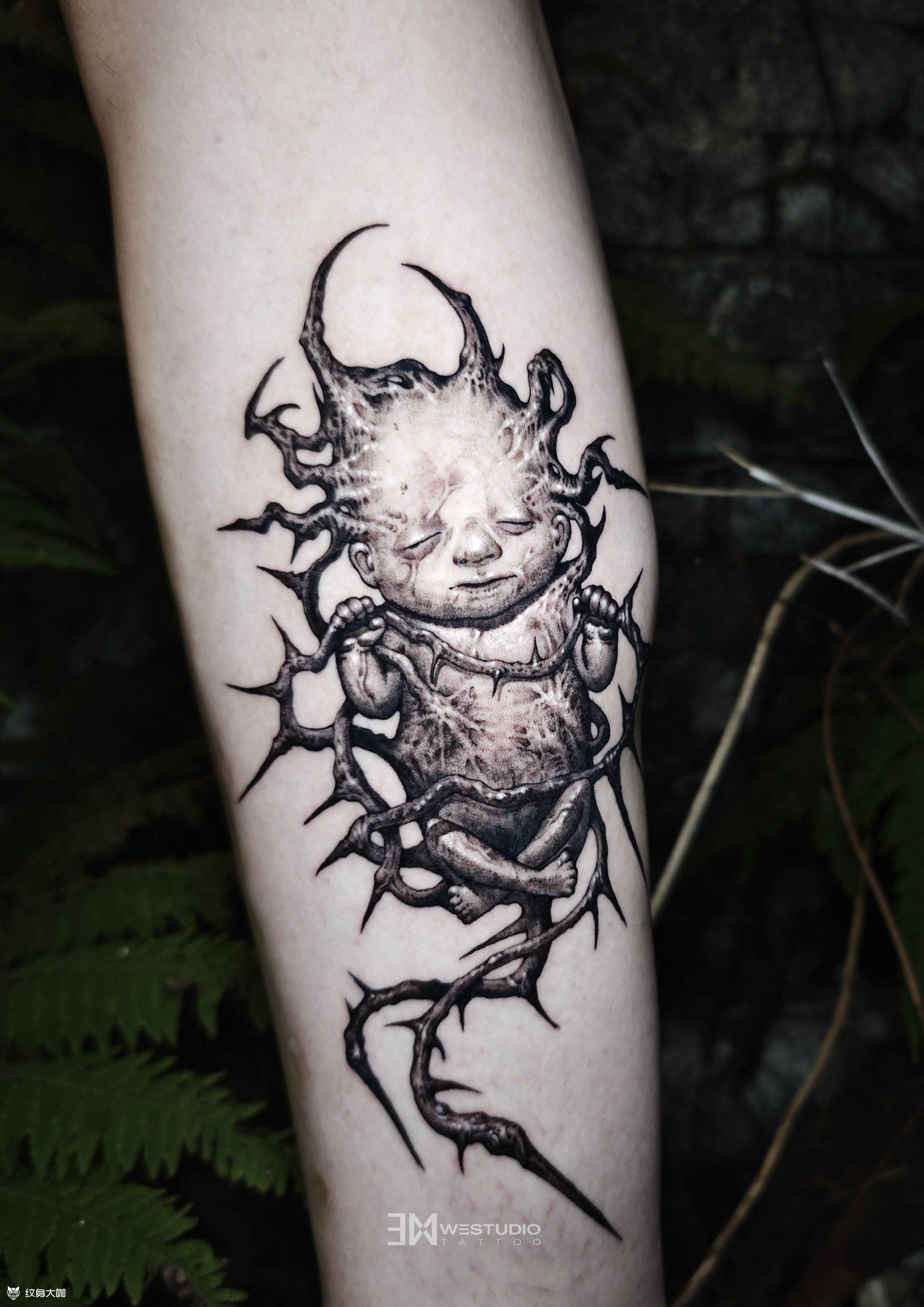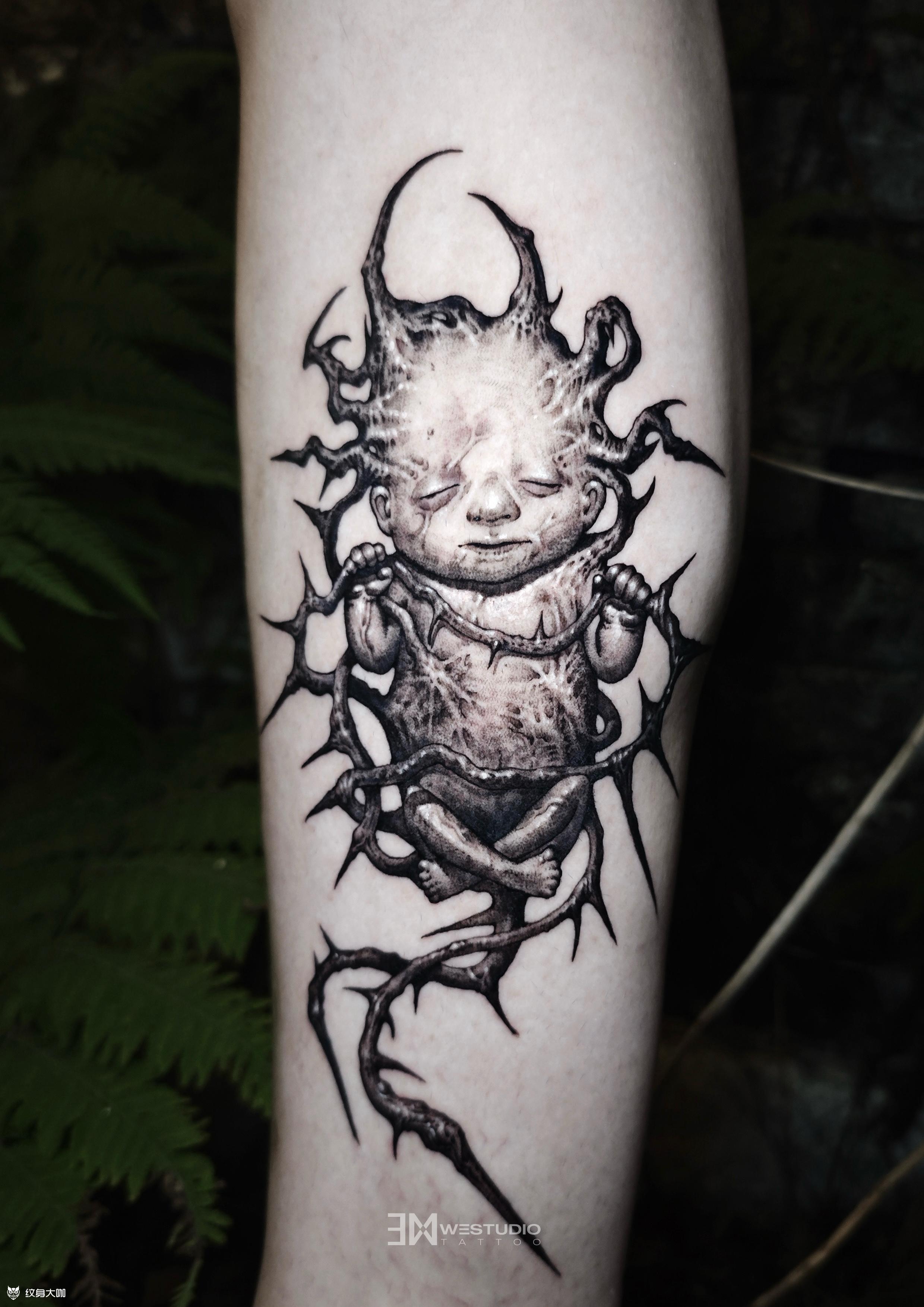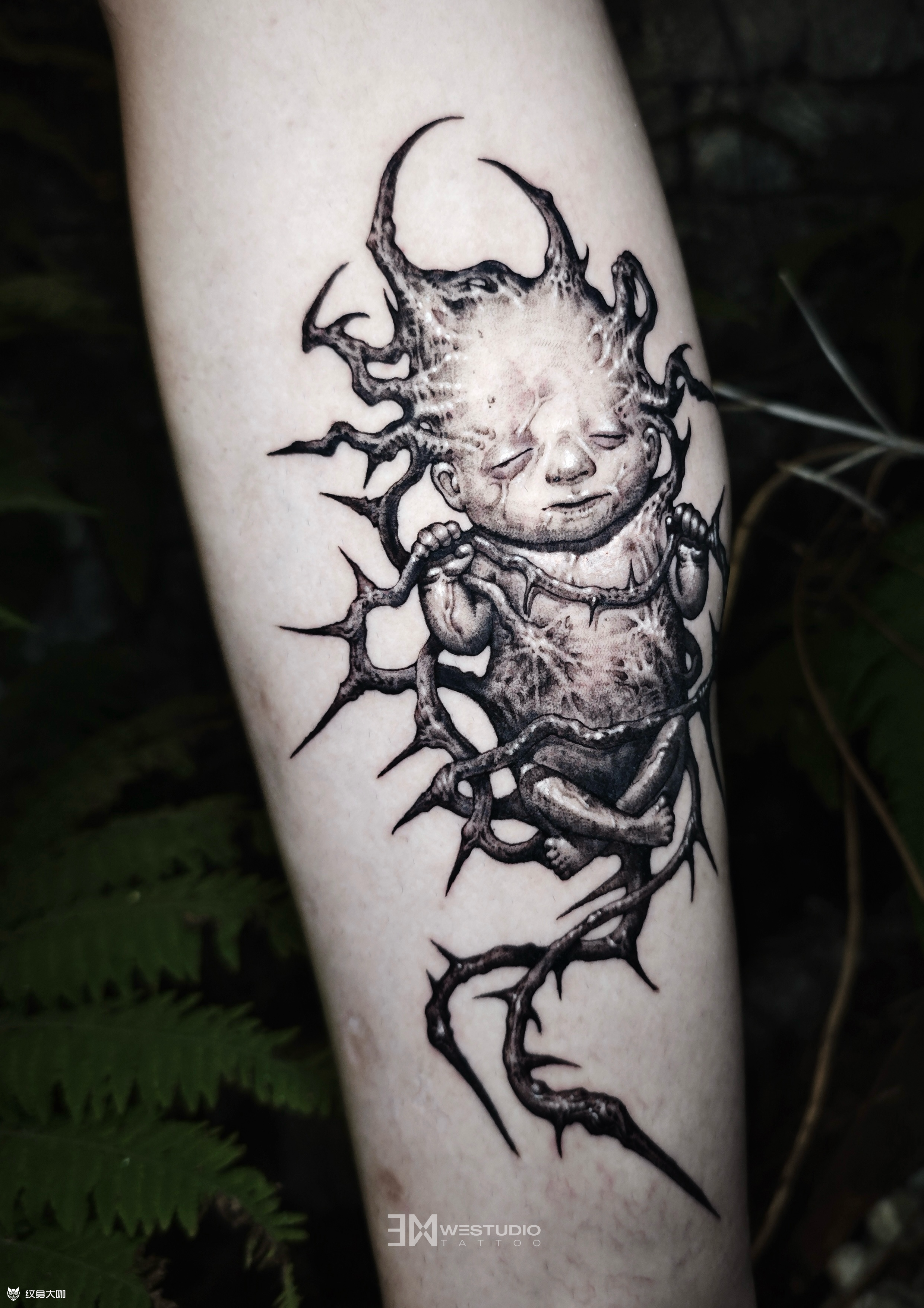 《小魔童》 混沌翻涌的世间, 异变婴在虚无迷雾里诞生。 小魔童的身躯生满狰狞尖刺, 每一寸骨棘都在沉默着反抗, 他以稚弱之形对抗这荒诞世界砸来的所有恶意与不公—— ◾️店内作品 by肥犬 ◾️WE STUDIO成都原创纹身工作室 ◾️定制设计作品|一人一图