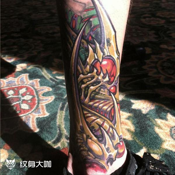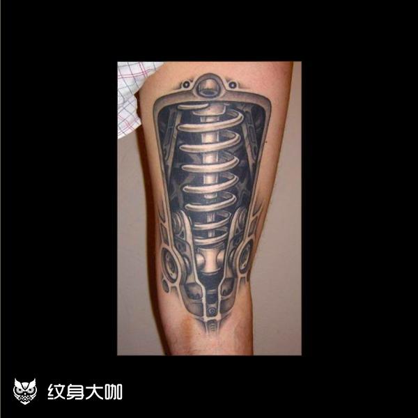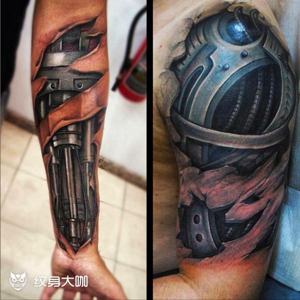 石雕机械龙凤臂 石雕机械龙凤臂。帅哥来自上海的同行,真的很感谢信任。设计中心理念,想要龙,凤,石雕,机械,人物肖像。剩下的让我发挥了,大臂石雕龙参考我师父的雕龙臂。大臂内侧我设计了一大俩小三个减震,加上胳膊拐弯处一个可活动的轴,连接上下臂活动的是四个小伸缩管。侧面用齿轮传动动力,肘关节设计的软连接,类似脊椎骨的连接,这样怎么动都有伸缩感,小臂外侧石雕凤凰,小臂内侧设计一个显示器,人物肖像就好做了。整体针刺时间50