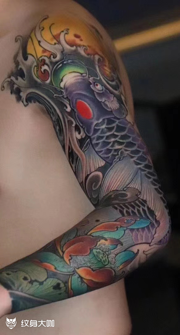 不一样的鲤鱼~耗时10小时。顾客给的题材是红鲤鱼、钱串、金蟾、荷花,完全是传统题材,但必须要做成我自己的风格,我善于把各种题材做成自己的风格,顾客每年都要从广州来找我纹身,感谢信任!