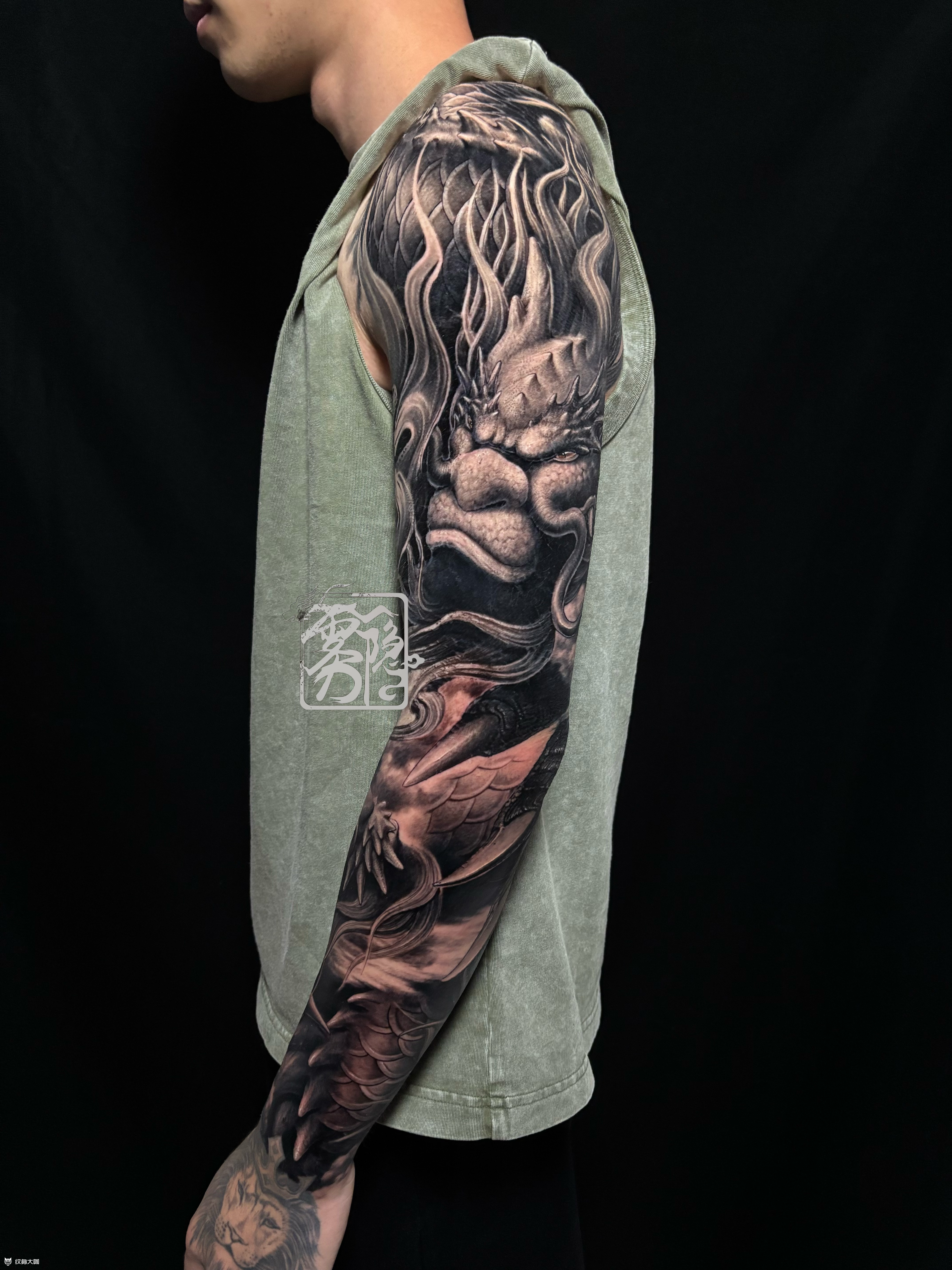 鲤鱼跃龙门 历时:7天完成,帅哥来自唐山,以写实风格呈现鲤鱼逆流而上的姿态,鱼尾动感上扬,鱼头朝上象征突破困境的意志力,龙门设计在肩膀前述的位置,有利于整体画面布局,让龙头整体更加连贯,对于作品都是承载者都想法沟通设计完成✅ 机器:御神机