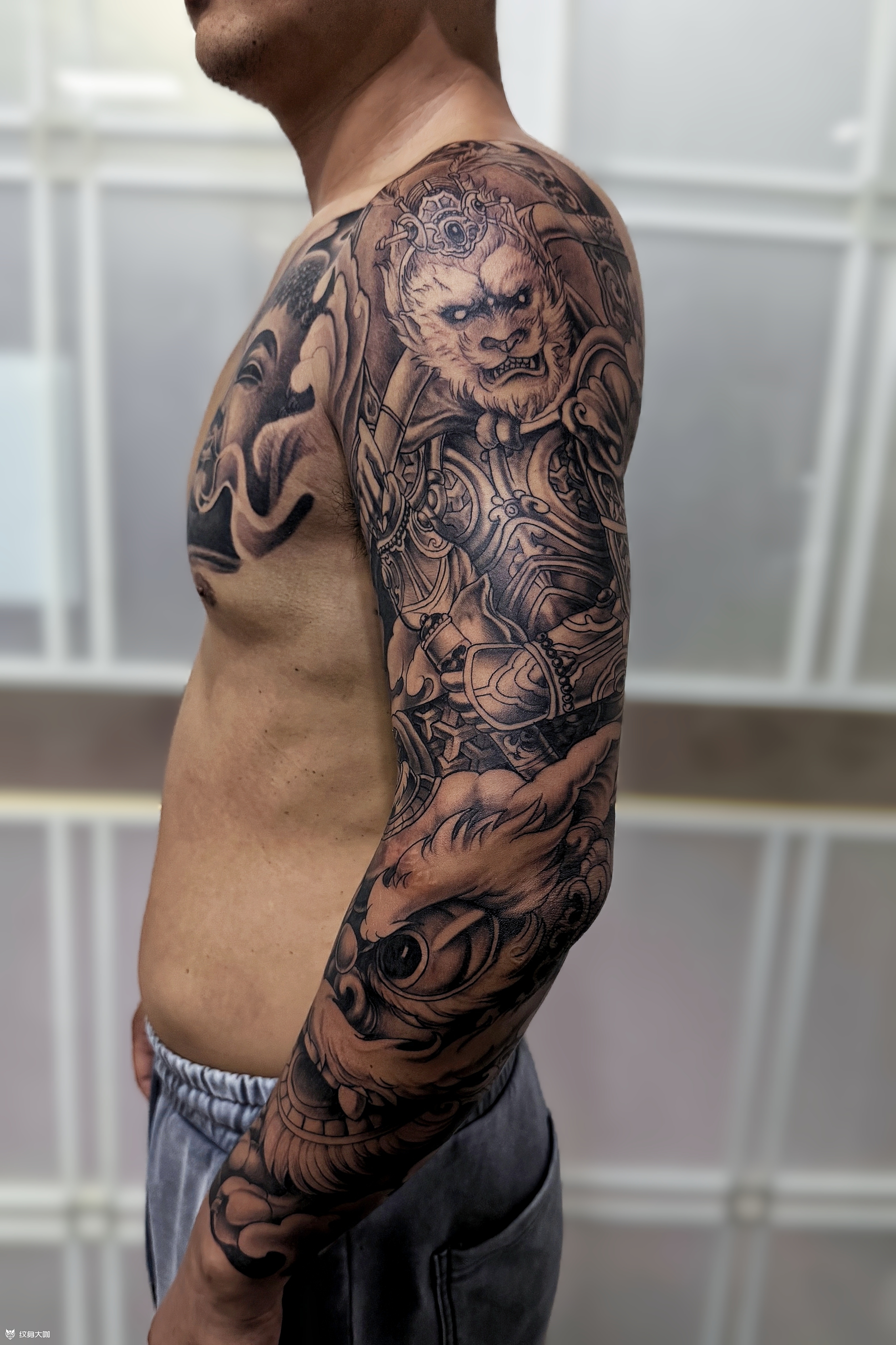 花甲纹身 十堰客,生肖猴,花臂纳三界:悟空是属相同源的桀骜魂,敢闹敢战;佛祖是心向澄明的引路灯,可安可悟;醒狮是奔赴坦途的祥瑞符,能喜能兴,纹的是故事,更是自我