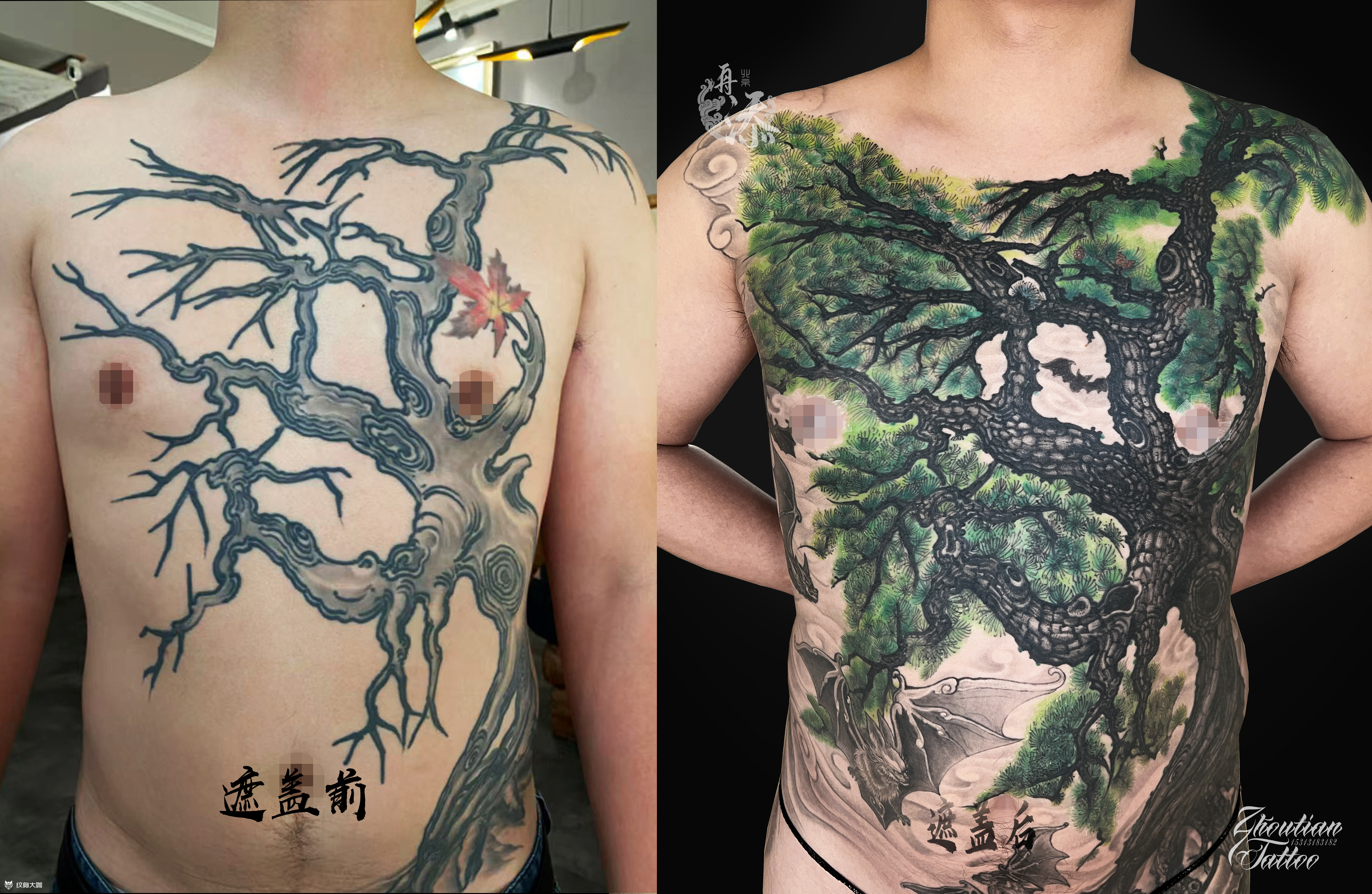 苍松覆旧枝 苍松覆旧枝 · 纹身修改作品介绍 旧作如枯木,线条清冷,独缀一叶红枫,似是未竟的心事。 我们以苍松为基,重绘生命的肌理。 虬龙般的枝干盘亘于前胸,松针如翠,层层叠叠,将过往的痕迹尽数化作新生的底色。 云雾缭绕间,蝙蝠振翅,寓意福至,让每一寸肌肤都成为承载故事的画卷。 从枯木到苍松,是对过去的和解,也是对未来的期许。 每一次修改,都是一次重生。
