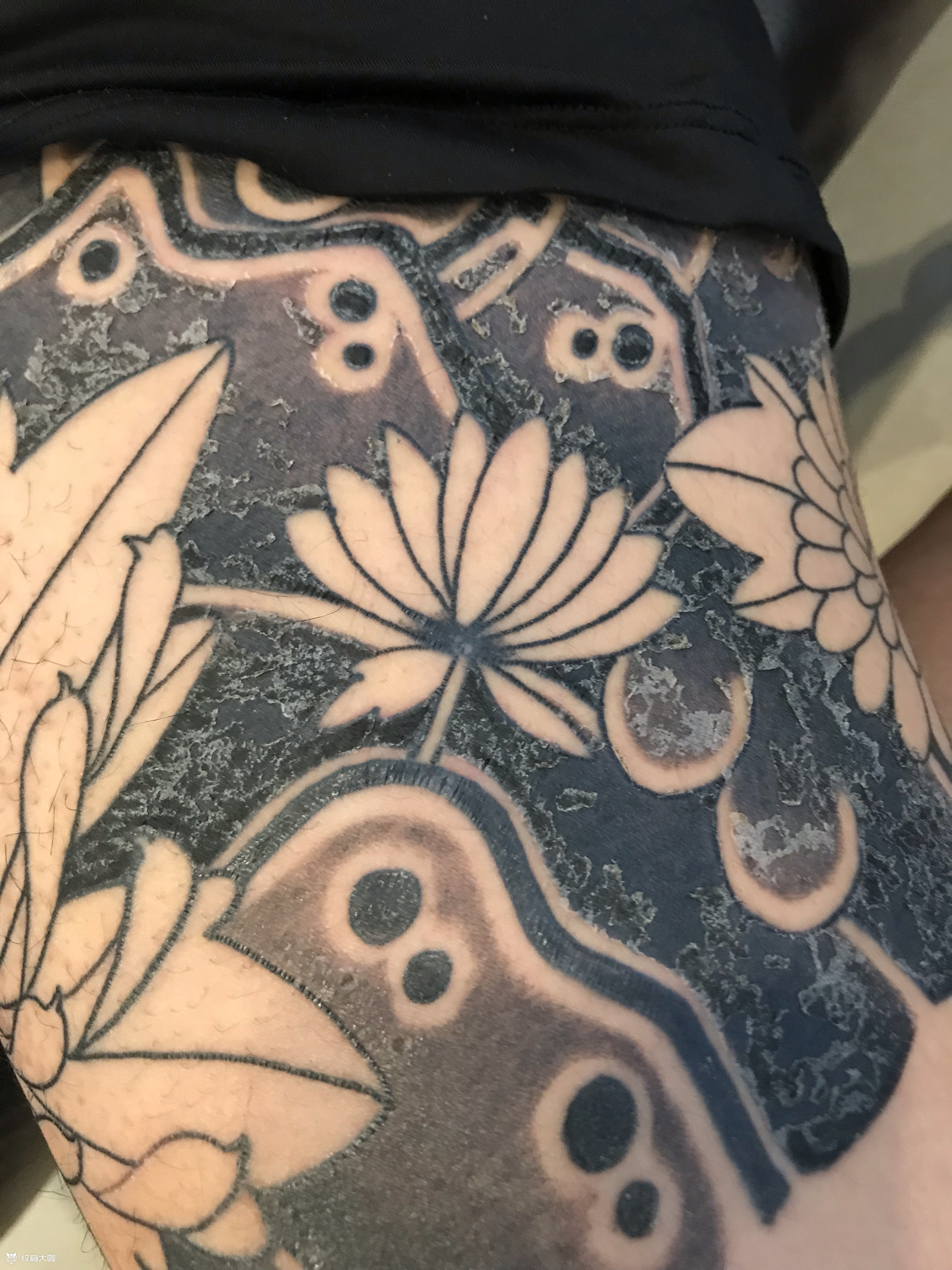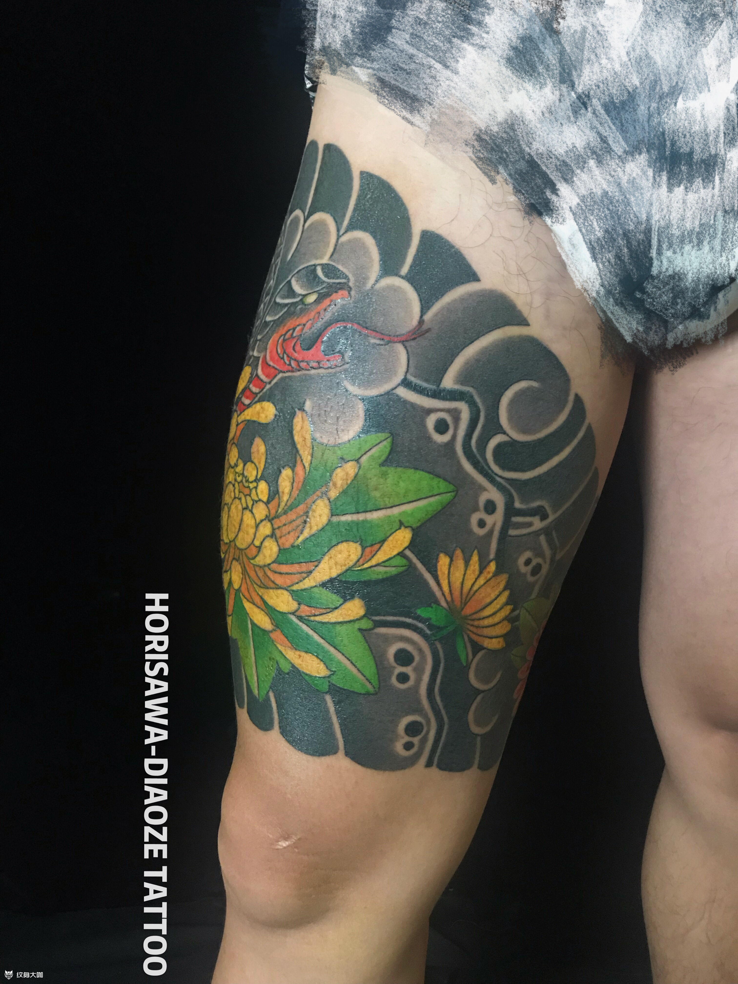 传统包大腿 根据客人想要的元素:蛇、菊花 做的设计。耗时10小时左右。