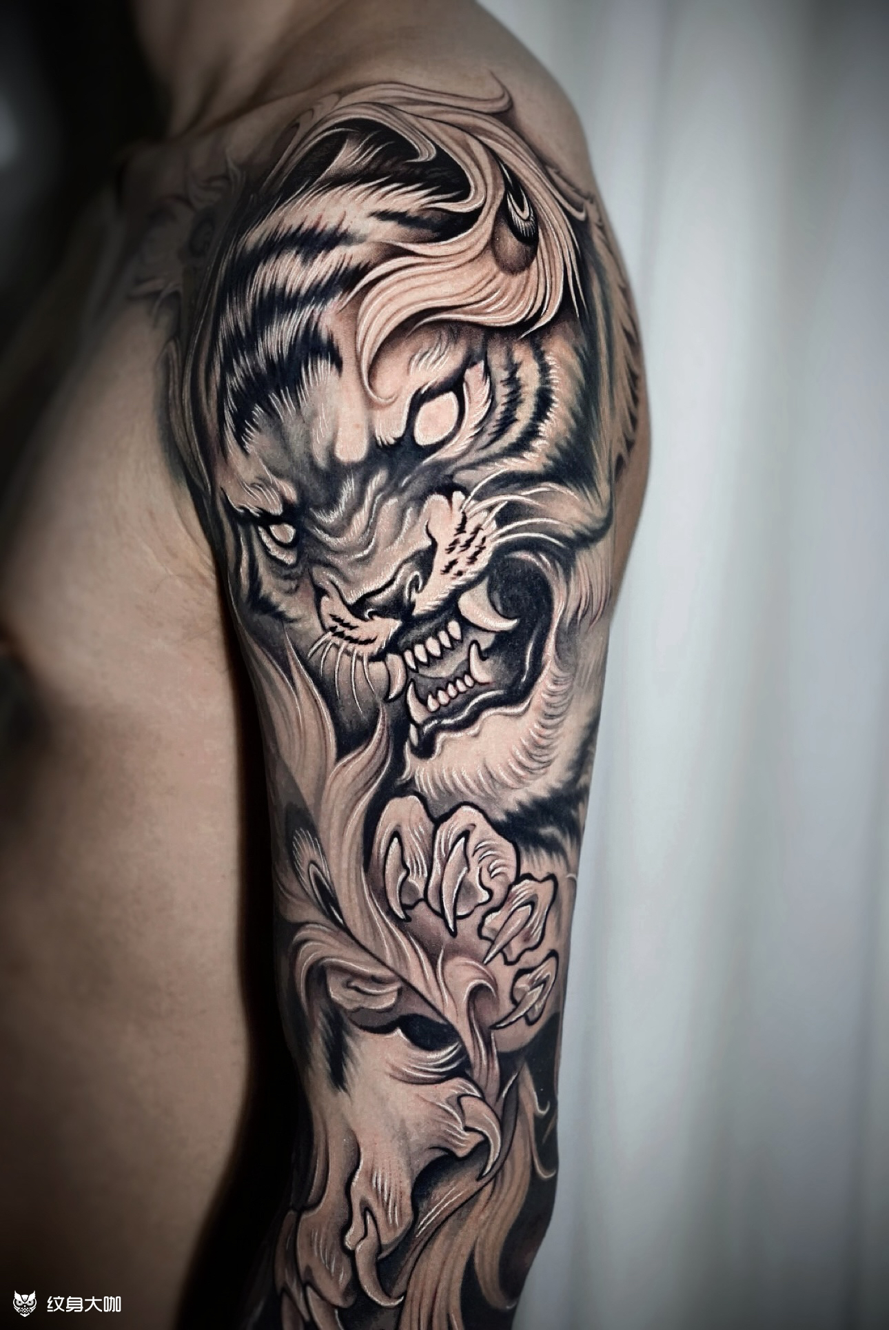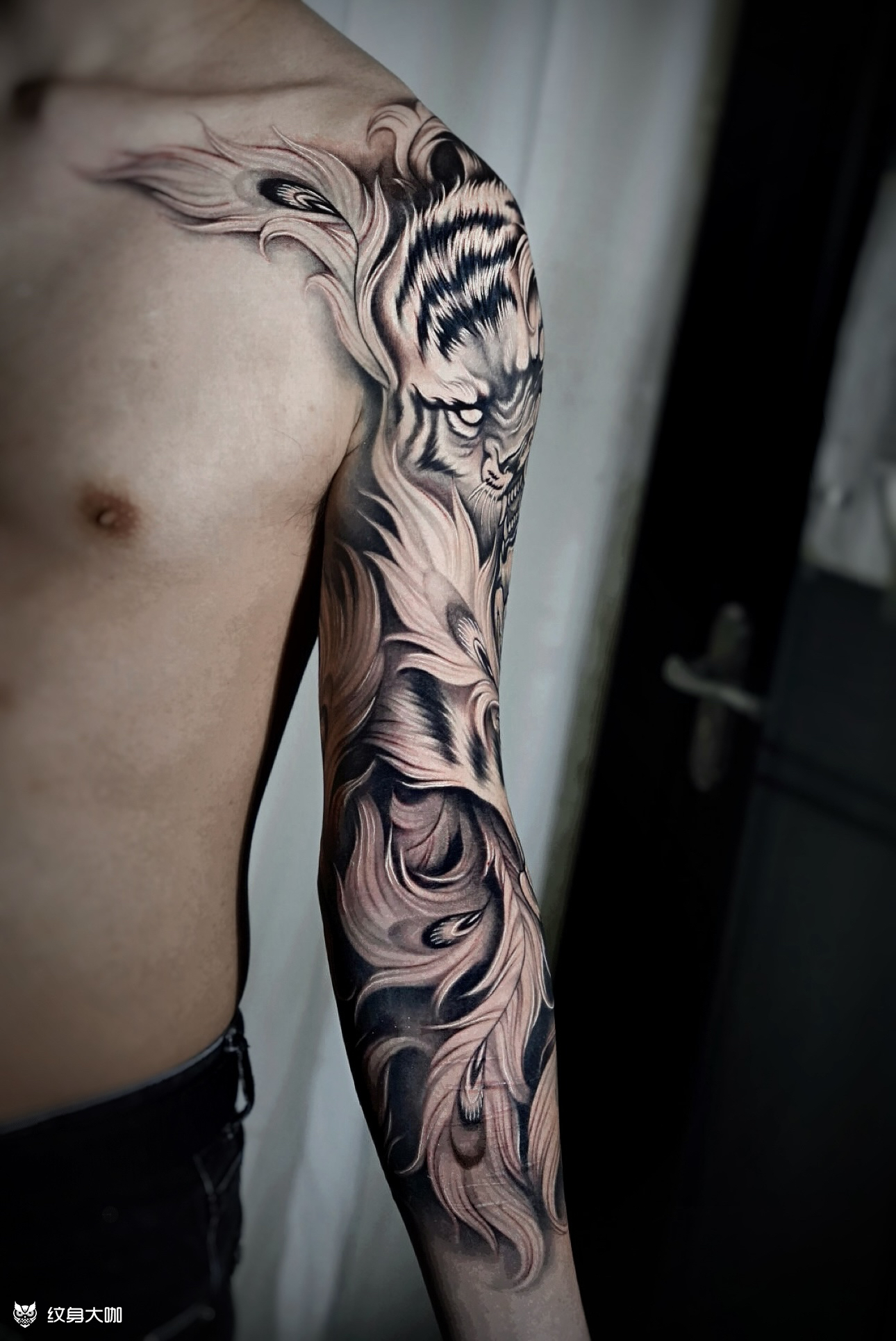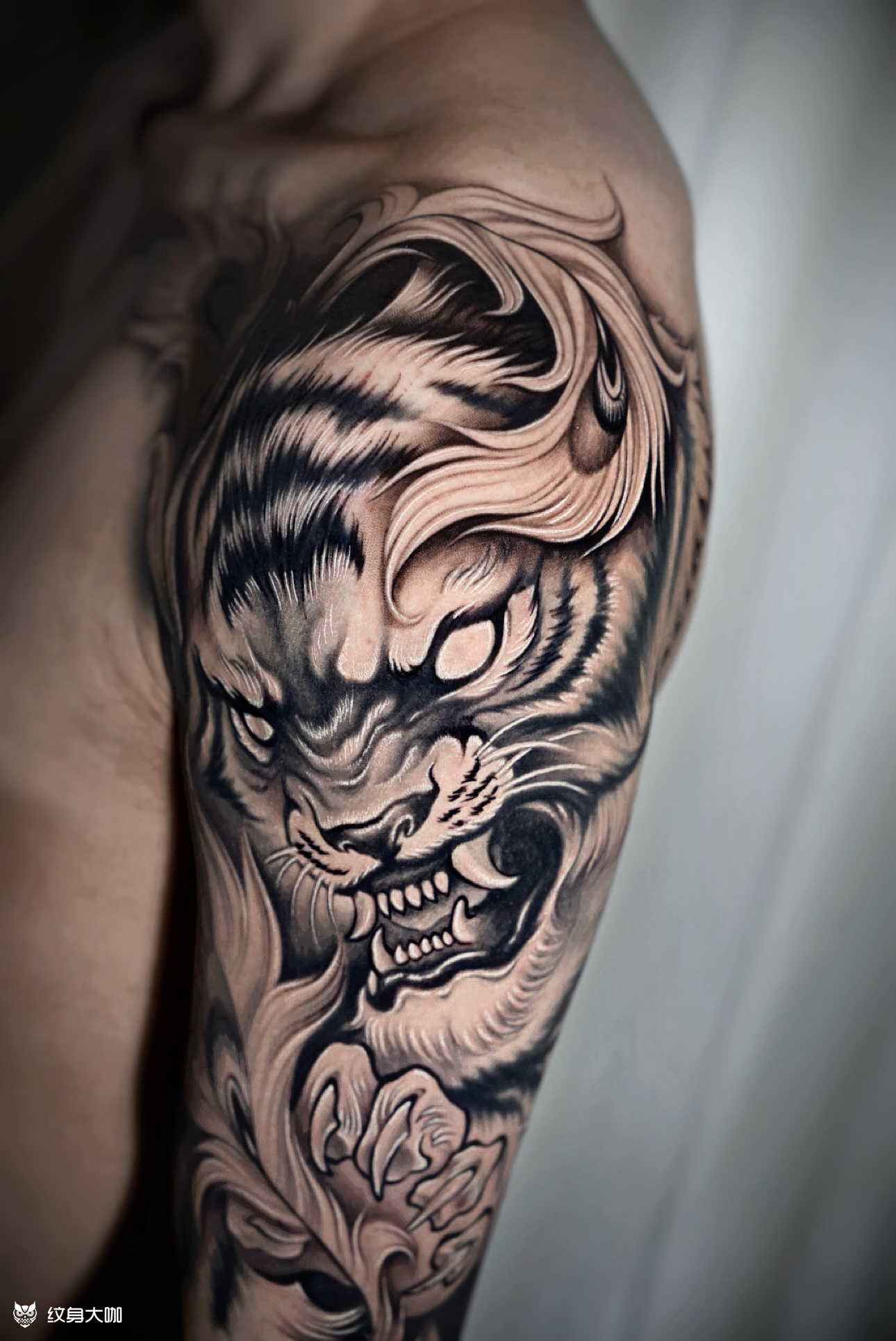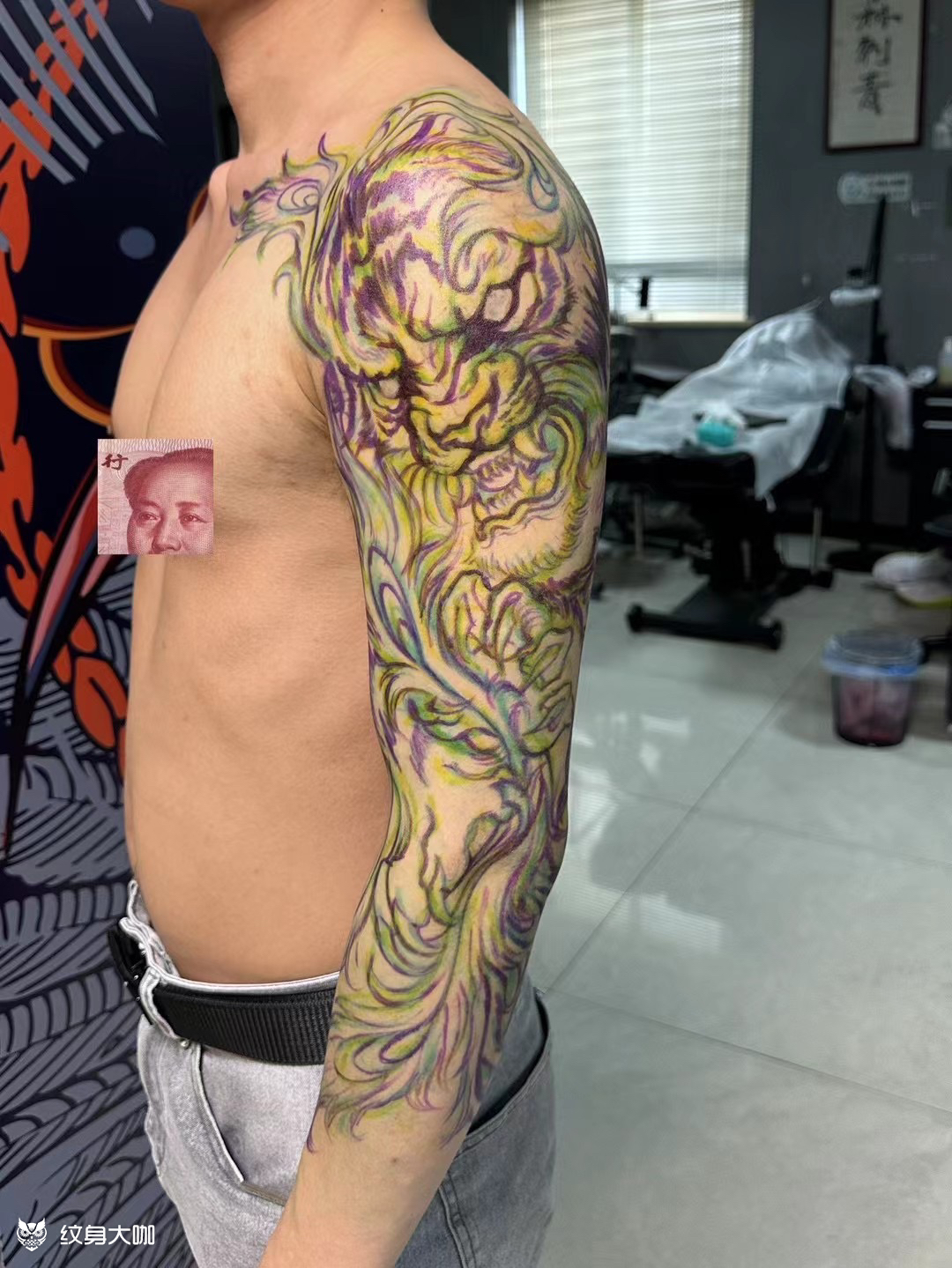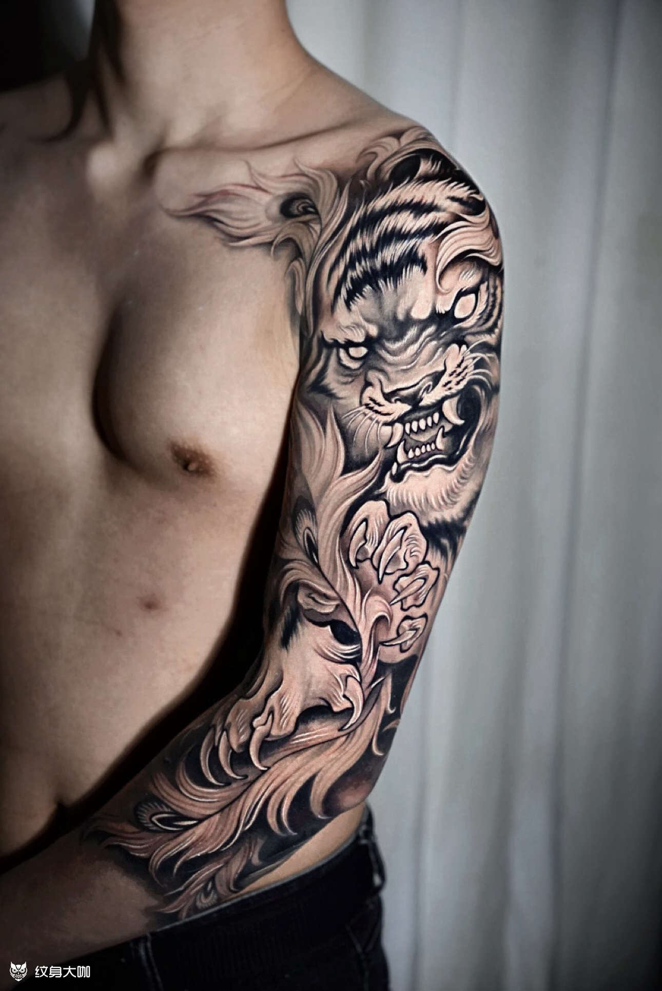 新传统如虎添翼 新传统七分袖【如虎添翼】毕业 手绘七分袖 所有都是根据身体结构构图 为了好看 锁骨是自然延伸的 爪子设计在中间 手弯曲的时候爪子也会动的同时不会变形 大臂凸起的地方正好放老虎头 这样显的老虎头更立体 提白都是凭感觉来的 把毛发一根一根效果提出来